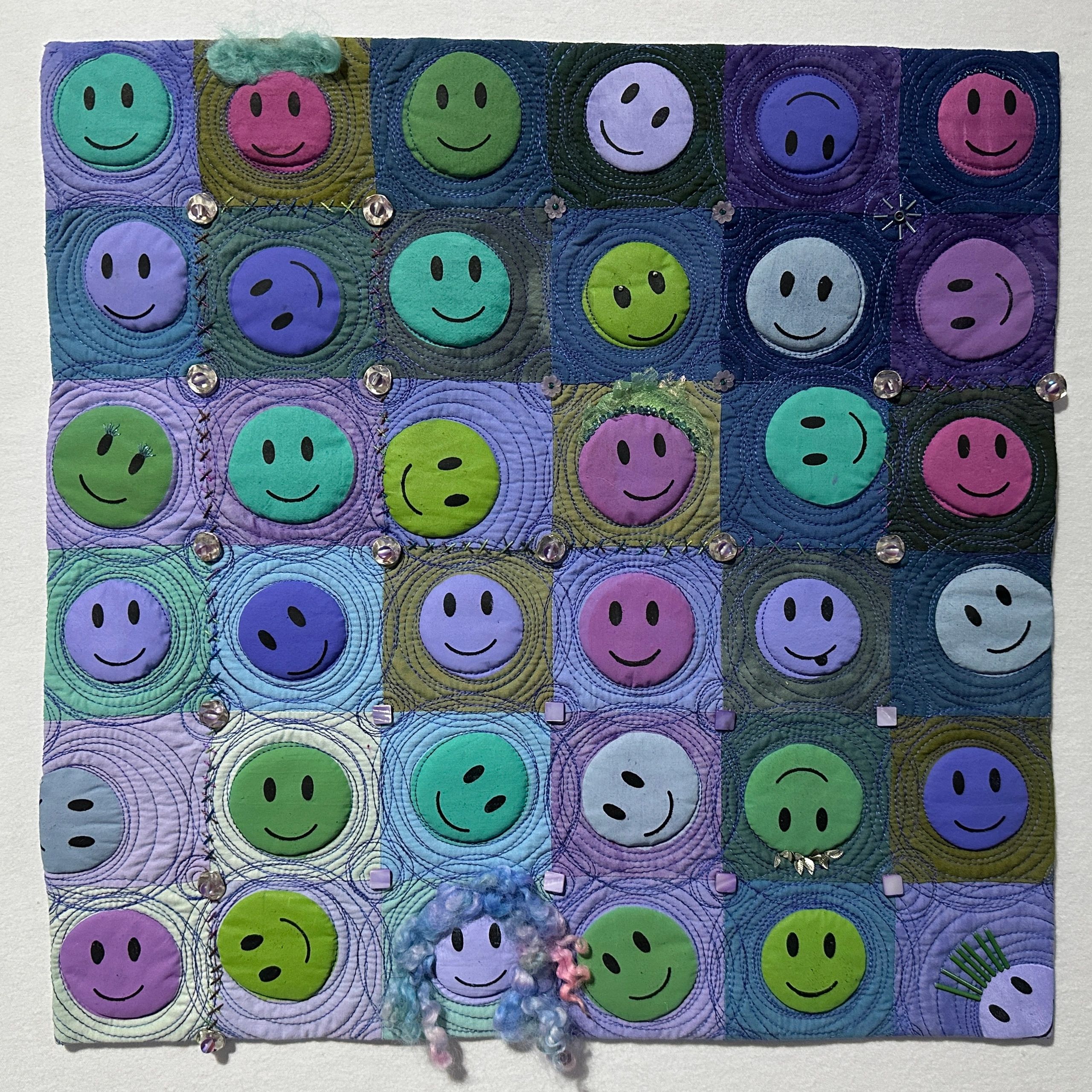 Our Emoji Art Quilt Exhibit has been accepted as an exhibit at 2026 AQS Quilt Week Shows throughout the U.S. The collection of quilts is modified. The 2026 dates are: Daytona Beach, FL, Feb 18-21; New England, Apr 8-11; Paducah, KY, Apr 22-25; Grand Rapids, MI Aug 19-22; Columbus, OH Sep 23-26. Art by Natalie Mouw.
